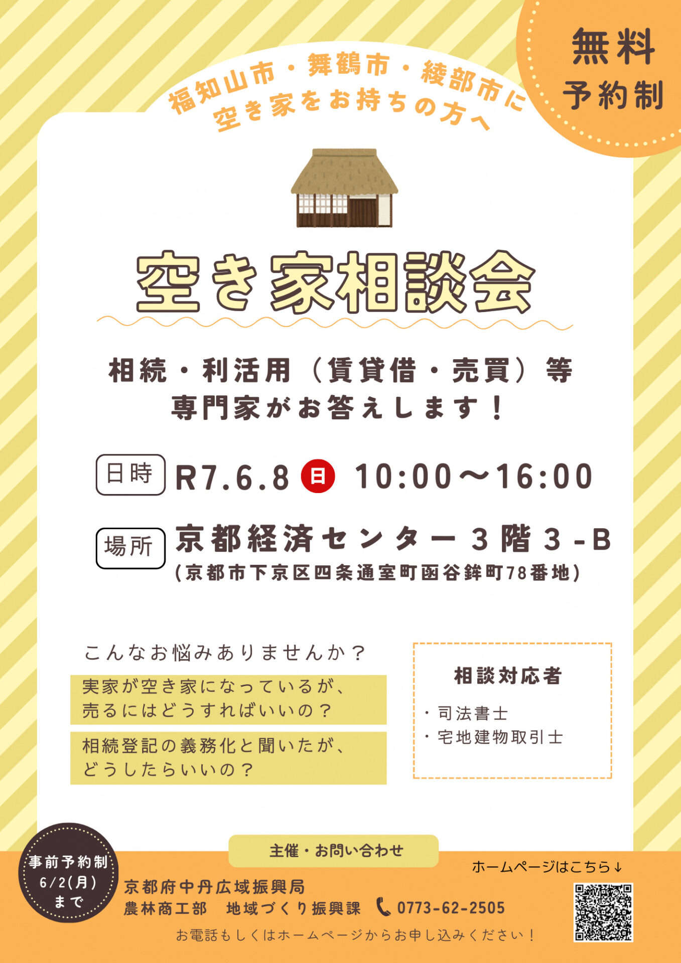 R7_1_空き家相談会_チラシ 2025年05月09日 関連キーワード キーワードを選択して検索すると同じキーワードを持つ記事が表示されます。キーワードは複数選択することもできます。 検 索 関連記事 お知らせ 2025年03月14日 【本イベントは終了しました】4/13(日)あやべ市(いち)・出張相談のお知らせ 毎月第2日曜日は「あやべ市(いち)」 あやべ定住サポート総合窓口の職員による出張相談だけでなく、実際に綾部の特産品や工芸品などに触れ綾部の魅力を感じていただけるイベントとなっています。 ぜひ皆さまのご来場をお待ちしており… お知らせ 2019年08月26日 「お世話になります」文化圏 ・・・・・用意してください、お願いします、頼りにしてます、よろしくお願いします。すべてを網羅することば「お世話になります」。 たとえば「クルマの移動をお世話になれますか?」といった具合に。 綾部では重宝されている魔法のこ… お知らせ 2025年04月29日 3DKアパート「美の里ハイツ」移住者向け特別賃料で募集を行っています! 「あやべ定住サポート総合窓口」と連携・協力し、新たな移住者の誘致に取り組んでいるボランティア組織「ここらへんのことつたえ隊」の隊員が所有する、3DKアパート「美の里ハイツ」で、、お試し移住ができるよう特別割引賃料での募集… お知らせ 2020年10月17日 オンライン案内を開始します。 あやべ定住サポートでは、オンライン会議システム「ZOOM」を活用したリモートによる空き家案内「オンライン案内」を開始します。 遠方で現地に来られない方も、空き家の状況を詳しく感じ取ってもらうため、職員が現地に出向きモニタ… お知らせ 2024年06月12日 【本イベントは終了しました】7/14(日)あやべ市(いち)・出張相談の開催 毎月第2日曜日は「あやべ市(いち)」 あやべ定住サポート総合窓口の職員による出張相談だけでなく、実際に綾部の特産品や工芸品などに触れ綾部の魅力を感じていただけるイベントとなっています。 ぜひ皆さまのご来場をお待ちしており… お知らせ 2025年01月20日 【本イベントは終了しました】2025/2/9(日)あやべ市(いち)・出張相談の開催 毎月第2日曜日は「あやべ市(いち)」 あやべ定住サポート総合窓口の職員による出張相談だけでなく、実際に綾部の特産品や工芸品などに触れ綾部の魅力を感じていただけるイベントとなっています。 ぜひ皆さまのご来場をお待ちしており… お知らせ 2021年05月17日 日帰り体験会「田植えと大豆蒔き」 日帰り体験会「田植えと大豆蒔き」参加者募集! すでにお知らせしている「小さな谷の小さな暮らし『暮らし仕事』ワークショップ」のお試しイベントとして田植えと大豆蒔きの体験会を実施します。お米も大豆ももちろん無農薬。お米は収穫… お知らせ 2025年10月20日 【本イベントは終了しました】11/9(日)あやべ市(いち)・出張相談のお知らせ 毎月第2日曜日は「あやべ市(いち)」 綾部の特産品や工芸品などに触れ綾部の魅力を感じていただけるイベントとなっています。 ぜひ皆さまのご来場をお待ちしております。 ◆開催日時 2025年11月9日(日) 11:00~16…
