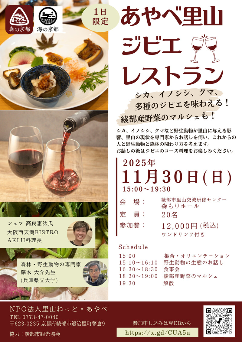 satoyamagibierrestaurant_2025 2025年11月17日 関連キーワード キーワードを選択して検索すると同じキーワードを持つ記事が表示されます。キーワードは複数選択することもできます。 検 索 関連記事 お知らせ 2025年04月29日 3DKアパート「美の里ハイツ」移住者向け特別賃料で募集を行っています! 「あやべ定住サポート総合窓口」と連携・協力し、新たな移住者の誘致に取り組んでいるボランティア組織「ここらへんのことつたえ隊」の隊員が所有する、3DKアパート「美の里ハイツ」で、、お試し移住ができるよう特別割引賃料での募集… お知らせ 2022年10月11日 あやべなまち旅2022 あやべなまち旅2022 「綾部で出会う 小さな体験」 綾部市に住む個性豊かな案内人が、それぞれの視点で まちを楽しむ「小さな体験」を企画しました。秋のお出掛けにぴったりのプランがずらり。「まち旅」で綾部で小さな体験してみ… お知らせ 2025年02月26日 届け!地域の魅力・就職イベント情報〜京都北部ふるさと便〜 ▷▷ 就活に役立つ就職イベント情報とイチオシ地域情報を掲載!! ◁◁ 京都府北部5市2町(福知山市・舞鶴市・綾部市・宮津市・京丹後市・伊根町・与謝野町)の就活イベントやイチオシの地域トピックスやイベントを掲載しています。… お知らせ 2025年10月20日 【本イベントは終了しました】11/9(日)あやべ市(いち)・出張相談のお知らせ 毎月第2日曜日は「あやべ市(いち)」 綾部の特産品や工芸品などに触れ綾部の魅力を感じていただけるイベントとなっています。 ぜひ皆さまのご来場をお待ちしております。 ◆開催日時 2025年11月9日(日) 11:00~16… お知らせ 2023年07月11日 京都北部お仕事百貨店~舞鶴・綾部編~ いろんな働き方、見てみませんか? 京都北部の舞鶴市と綾部市で様々な働き方をする人達を訪問して、その暮らし方、生き方を知る2日間。 イベント概要 日 時:8/26(土)10:30~8/27(日)15:00予定 場 所:… お知らせ 2024年08月19日 【本イベントは終了しました】9/8(日)あやべ市(いち)・出張相談の開催 毎月第2日曜日は「あやべ市(いち)」 あやべ定住サポート総合窓口の職員による出張相談だけでなく、実際に綾部の特産品や工芸品などに触れ綾部の魅力を感じていただけるイベントとなっています。 ぜひ皆さまのご来場をお待ちしており… お知らせ 2021年02月25日 にしやたキラキラチャンネル 2020年11月、西八田地区の30~40代の有志が集まって、にしやたキラキラ情報局が発足しました。 西八田に住む人の視点で、西八田地区でキラキラする人、チャレンジする人や団体を紹介する動画を取材・制作し、 月に1~2本、… お知らせ 2025年04月17日 【本イベントは終了しました】5/11(日)あやべ市(いち)・出張相談のお知らせ 毎月第2日曜日は「あやべ市(いち)」 あやべ定住サポート総合窓口の職員による出張相談だけでなく、実際に綾部の特産品や工芸品などに触れ綾部の魅力を感じていただけるイベントとなっています。 ぜひ皆さまのご来場をお待ちしており…